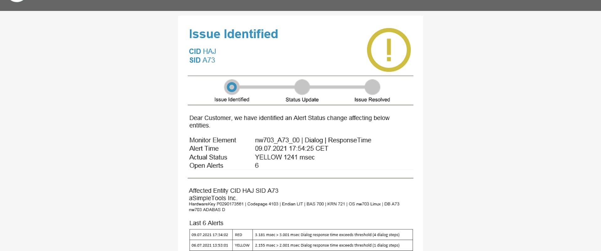 So you are always informed about the status of your SAP® systems. When the alarm status changes (green - yellow - red - yellow - green) you immediately receive an email - without complicated mail setup. If required, you can easily adapt the email templates to your needs.